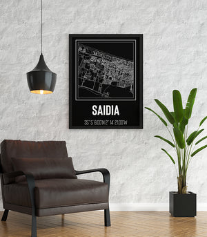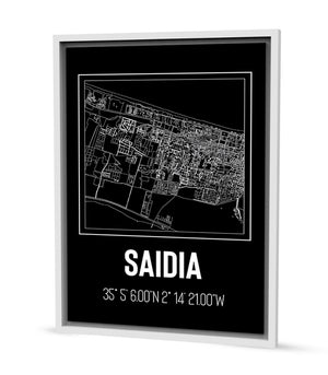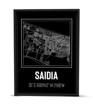 Ce tableau décoratif offre une représentation artistique de Saïdia, avec des tracés blancs minutieusement dessinés qui contrastent avec le fond noir, évoquant une promenade nocturne à travers les rues éclairées de la ville. Le design sobre et la palette monochrome donnent à l'œuvre un air de modernité et d'élégance, faisant de ce tableau un ajout parfait pour toute décoration intérieure recherchant une touche d'urbanité sophistiquée. Les coordonnées géographiques inscrites en bas renforcent l'authenticité de la carte, et invitent le spectateur à découvrir ou redécouvrir la ville de Saïdia sous un angle unique.