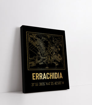 Ce tableau décoratif offre une évocation historique des tracés urbains d'Errachidia, une ville emblématique du Maroc. Chaque ligne et chaque détail cartographique évoquent un riche héritage culturel, des anciens remparts aux quartiers animés. Cette représentation artistique plonge le spectateur dans l'histoire captivante d'Errachidia, où le passé et le présent se conjuguent harmonieusement.