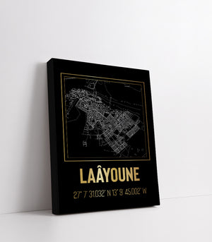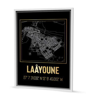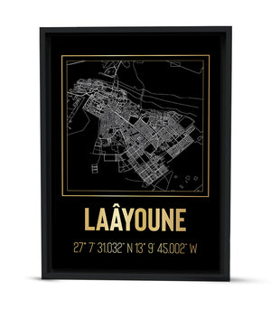 Ce tableau décoratif, magnifique dans sa simplicité, présente les rues et les voies de Laâyoune sous la forme de tracés lumineux sur un fond sombre. La palette en noir et doré ajoute une dimension de luxe et de mystère, transformant un plan de ville classique en une œuvre d'art moderne. Les coordonnées géographiques précises, mises en évidence en lettres dorées, invitent à une réflexion sur la place de Laâyoune dans le monde et dans nos espaces de vie. Ce tableau est une célébration graphique de la géographie urbaine, parfaite pour ceux qui cherchent à intégrer un élément de design énigmatique et élégant à leur environnement.