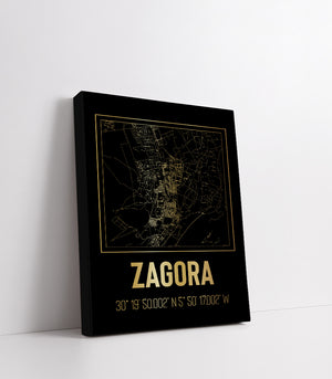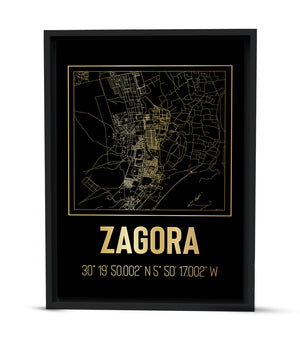 Cette image est une représentation artistique en noir et doré de la ville de Zagora, située au cœur du désert marocain. Elle capture avec précision les rues sinueuses et les oasis verdoyantes qui font le charme de cette ville emblématique. Les détails minutieux, des dunes de sable aux architectures traditionnelles, donnent vie à cette œuvre et vous transportent au cœur de l'aventure et de l'exotisme.