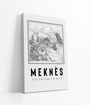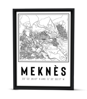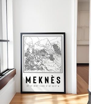 Cette image est une carte en noir et blanc de la ville de Meknès, au Maroc. Elle montre de manière détaillée et en vue aérienne le tissu urbain de la ville, avec ses routes, ses bâtiments et autres caractéristiques géographiques.
