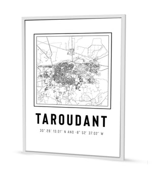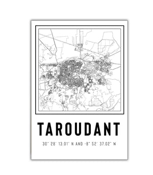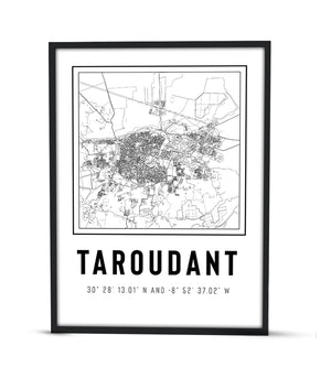Ce tableau dépeint avec finesse le cœur historique de Taroudant, entouré de ses murailles légendaires, au travers d'une cartographie épurée où les lignes claires se détachent sur le fond sombre, évoquant le réseau complexe des ruelles et des remparts de la ville. L'alliance de l'art décoratif et de la précision cartographique fait ressortir le caractère historique et intemporel de Taroudant, créant un jeu de contrastes entre lumière et ombre. Cet ouvrage n'est pas qu'une simple décoration, c'est un morceau d'histoire qui apporte une élégance ancienne à un intérieur moderne.