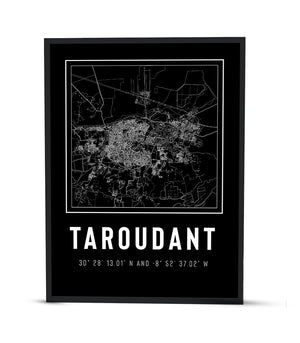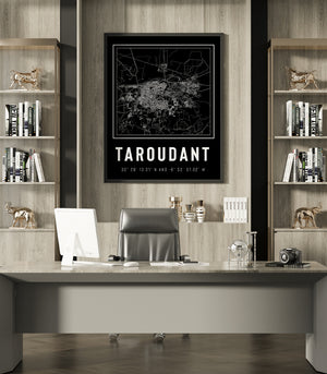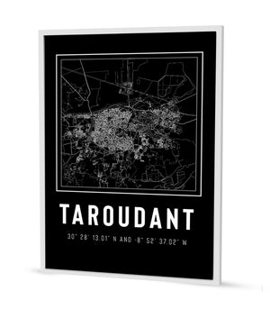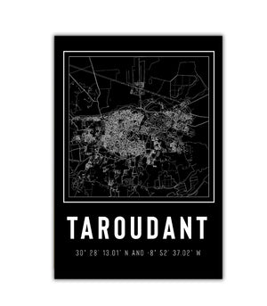 Ce tableau dépeint avec finesse le cœur historique de Taroudant, entouré de ses murailles légendaires, au travers d'une cartographie épurée où les lignes claires se détachent sur le fond sombre, évoquant le réseau complexe des ruelles et des remparts de la ville. L'alliance de l'art décoratif et de la précision cartographique fait ressortir le caractère historique et intemporel de Taroudant, créant un jeu de contrastes entre lumière et ombre. Cet ouvrage n'est pas qu'une simple décoration, c'est un morceau d'histoire qui apporte une élégance ancienne à un intérieur moderne.